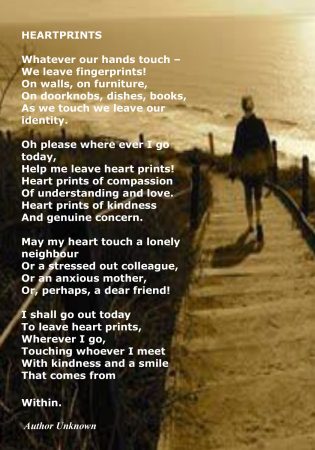 I found a version of this poem on the web years ago and fell in love with the concept of ‘heart prints’. I did a google search today and discovered a few different versions of the poem, all signed Author Unknown. Here is mine. As you sail through this week, may you stop and leave... Continue Reading →